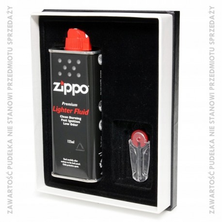 Przedmiotem aukcji jest pudełko prezentowe na zapalniczkę Zippo, benzynę Zippo oraz kamienie.