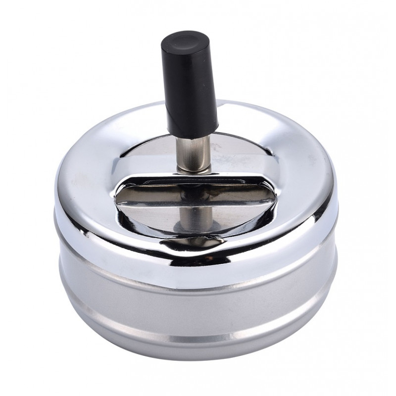 Popielniczka obrotowa-automatyczna, metalowa w kolorze srebrnym.