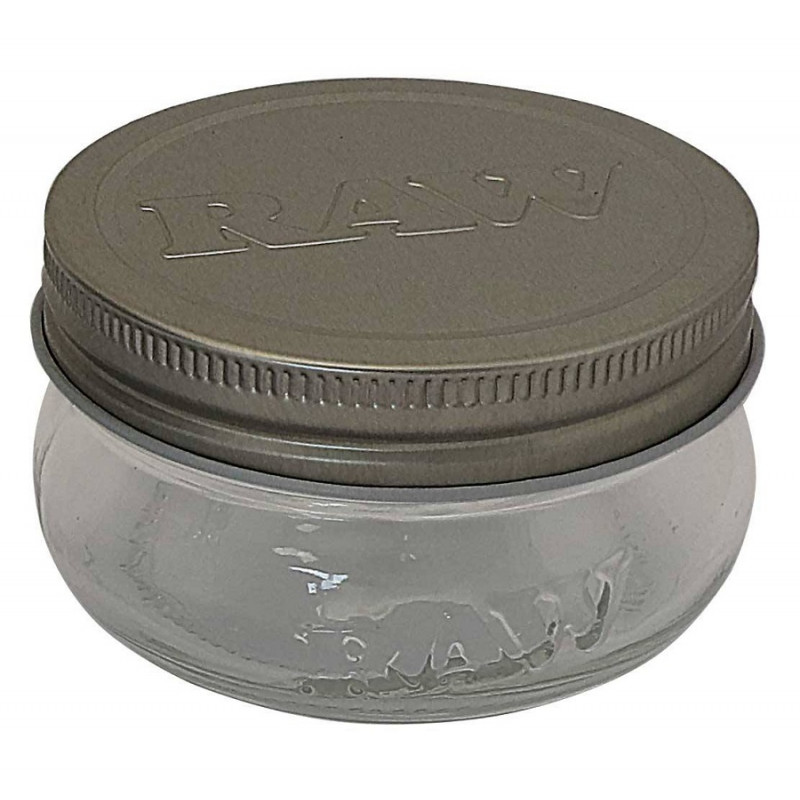 Słoik wykonany ze szkła z wytłoczonym logo RAW na pokrywce.