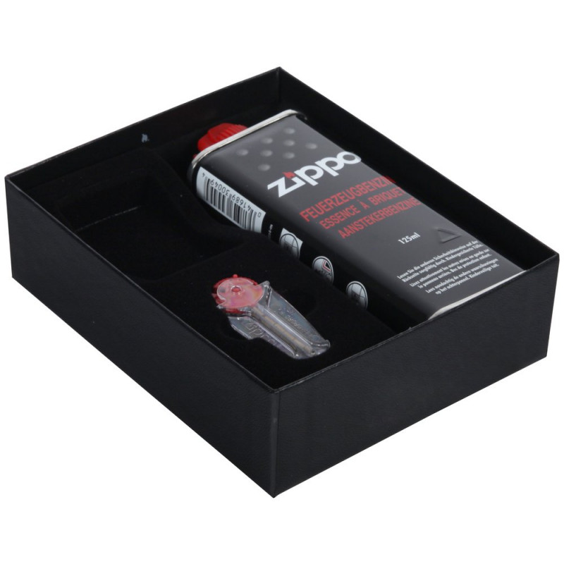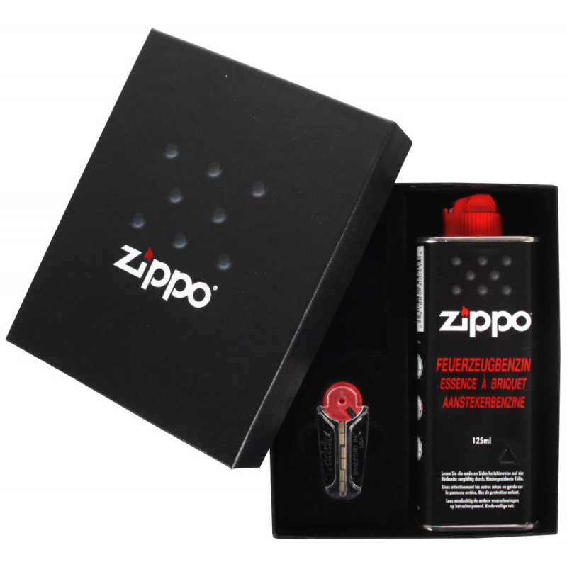 Pełen komplet – w pudełku znajdziesz benzynę i kamienie, czyli wszystko, czego potrzebujesz, aby zadbać o swoją zapalniczkę Zippo.