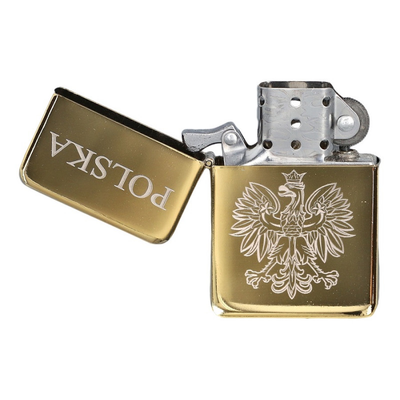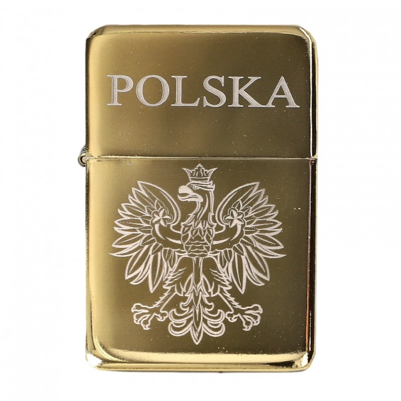 Stylowa i solidna zapalniczka benzynowa w kolorze złotym to połączenie klasy i patriotycznego akcentu. Na jej powierzchni znajduje się grawer z napisem „Polska” oraz wizerunkiem orła, co nadaje jej wyjątkowego, eleganckiego charakteru.