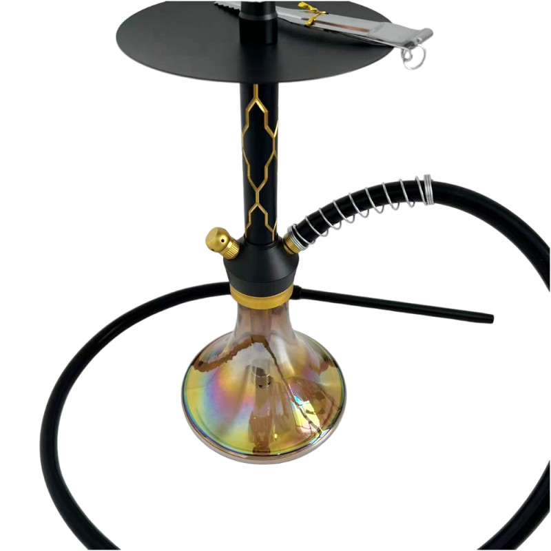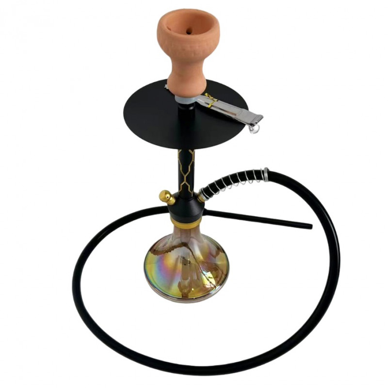 Fajka wodna Lunar to idealne połączenie solidnej jakości z rozsądną ceną. Jej elegancki wygląd podkreśla wyjątkowe zestawienie głębokiej czerni ze złotymi akcentami oraz waza w mieniącym się kolorze, która dodaje całości unikalnego charakteru i przyciąga wzrok.