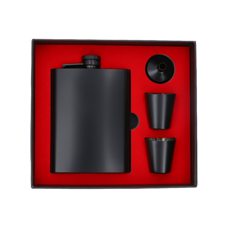Stylowy zestaw Black Edition z piersiówką o pojemności 240 ml (8 oz), wykonany z wytrzymałej stali nierdzewnej w kolorze matowej czerni. W komplecie znajdują się dwa kieliszki 35 ml oraz praktyczny lejek ułatwiający napełnianie. Całość zamknięta w eleganckim pudełku z czerwonym wkładem – to idealny, gotowy prezent, który nie wymaga dodatkowego pakowania.