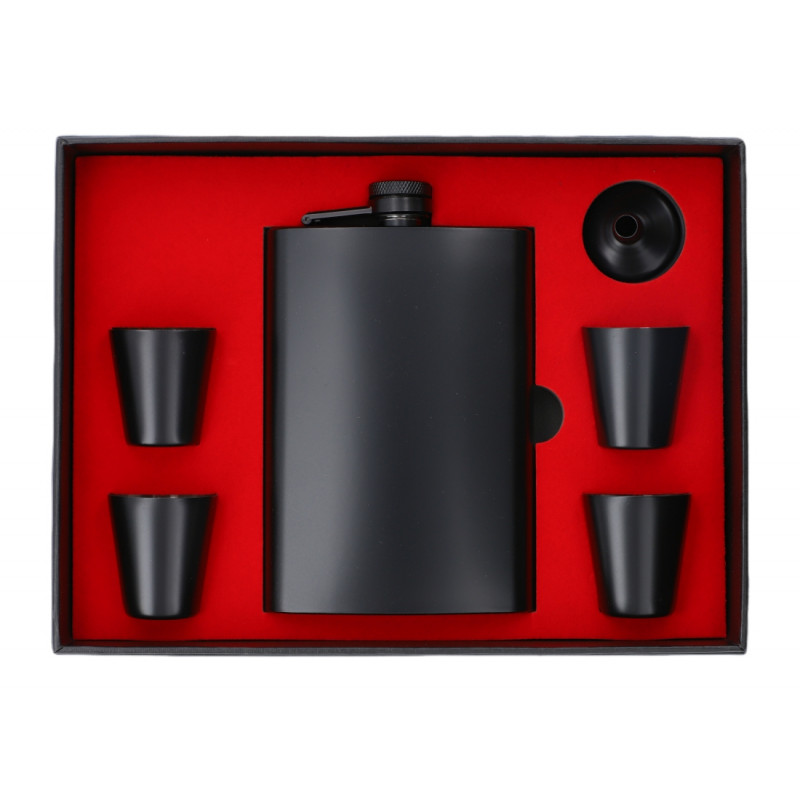 Elegancki zestaw Black Edition z piersiówką o pojemności 240 ml (8 oz), wykonany z wysokiej jakości stali nierdzewnej w stylowym, matowym czarnym wykończeniu. Ten rozbudowany komplet zawiera aż cztery kieliszki (35 ml) oraz praktyczny lejek, co czyni go idealnym wyborem na spotkania w większym gronie.