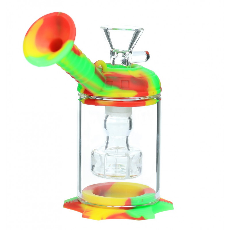 Bongo wodne o wysokości 12,5cm, wykonane z grubego żaroodpornego szkła borokrzemowego oraz silikonu.