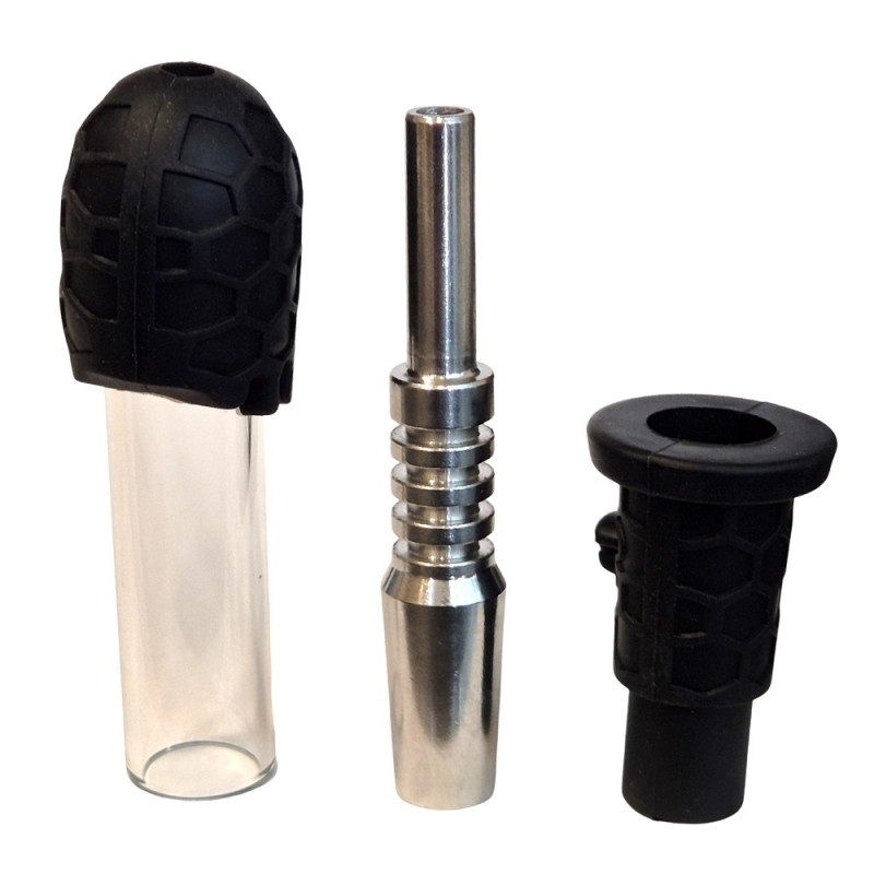 Praktyczny i poręczny kolektor nektaru o długości 16,5 cm, zaprojektowany z myślą o wygodzie użytkowania oraz trwałości. Końcówka (gwóźdź) wykonana jest z odpornej stali, środkowa część ze szkła, natomiast kolorowe elementy z wysokiej jakości silikonu, co zapewnia dobrą izolację termiczną oraz pewny chwyt.