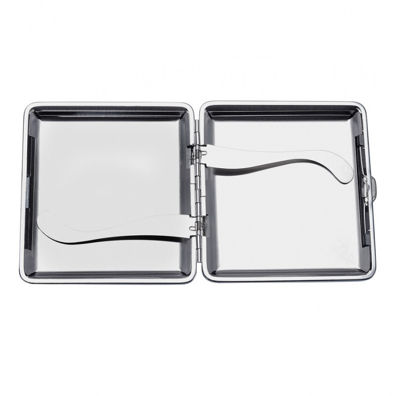 Wnętrze papierośnicy wyposażone jest w metalowe blaszki dociskowe, które stabilnie trzymają papierosy po obu stronach, chroniąc je przed uszkodzeniem i przemieszczaniem się. Zamknięcie na zatrzask zapewnia szybki dostęp oraz pewne domknięcie etui.