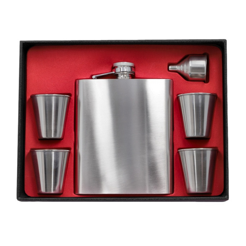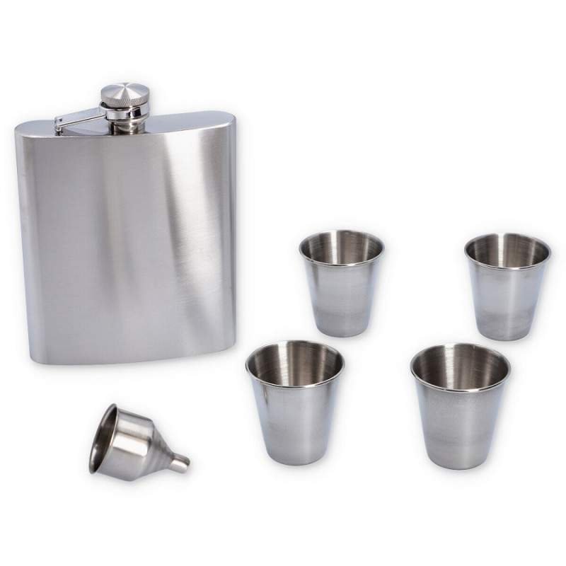 Elegancki zestaw z piersiówką o pojemności 540 ml (18 oz), wykonany z wysokiej jakości stali nierdzewnej w srebrnym kolorze. Ten rozbudowany komplet zawiera aż cztery kieliszki (80 ml) oraz praktyczny lejek, co czyni go idealnym wyborem na spotkania w większym gronie.