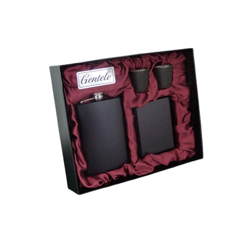 Elegancki i praktyczny zestaw prezentowy dla osób ceniących klasyczne, stylowe dodatki. W skład kompletu wchodzi czarna piersiówka o pojemności 240 ml (8 oz), wykonana z wysokiej jakości stali nierdzewnej, dwa kieliszki o pojemności 35 ml oraz metalowa papierośnica w kolorze czarnym.