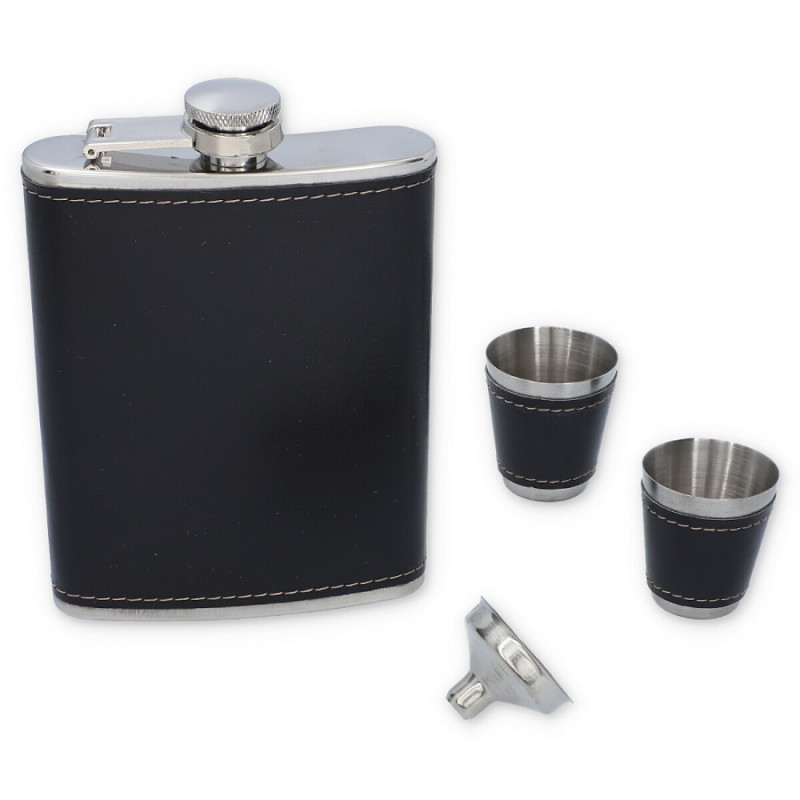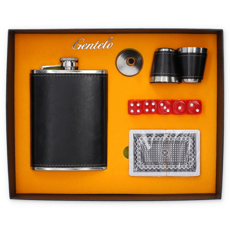 Elegancki i oryginalny zestaw prezentowy łączący klasykę z nutą rozrywki. W komplecie znajduje się piersiówka o pojemności 240 ml, wykonana ze stali nierdzewnej i pokryta czarną ekoskórą, która nadaje jej stylowy wygląd oraz zapewnia pewny chwyt.