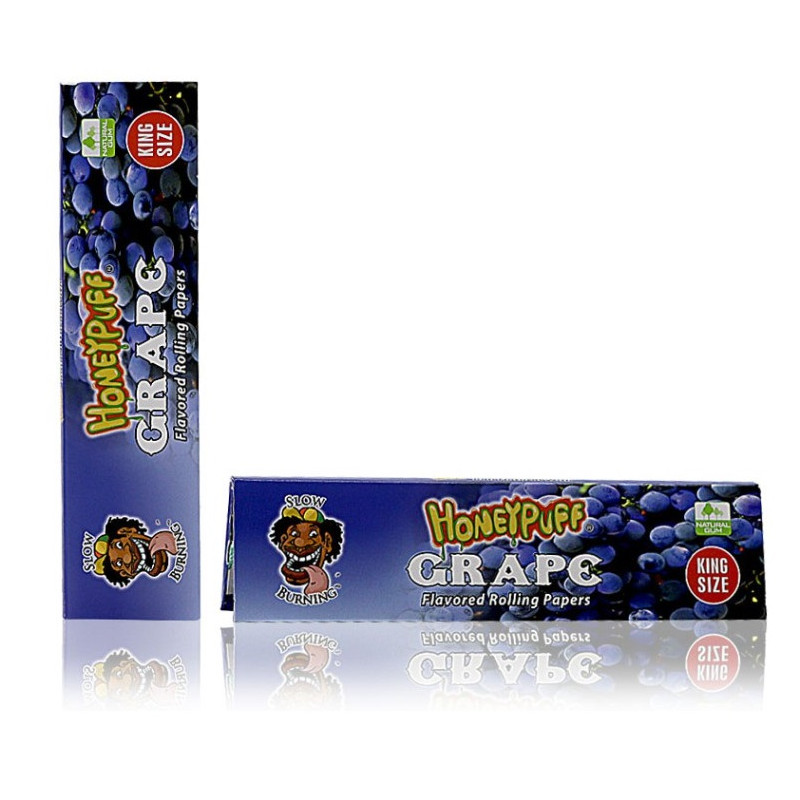 Aromatyzowane bibułki do skręcania amerykańskiej marki HONEYPuff o smaku jagodowym (Grape). W rozmiarze King Size (110 mm), idealne dla osób ceniących większy format i komfort użytkowania.