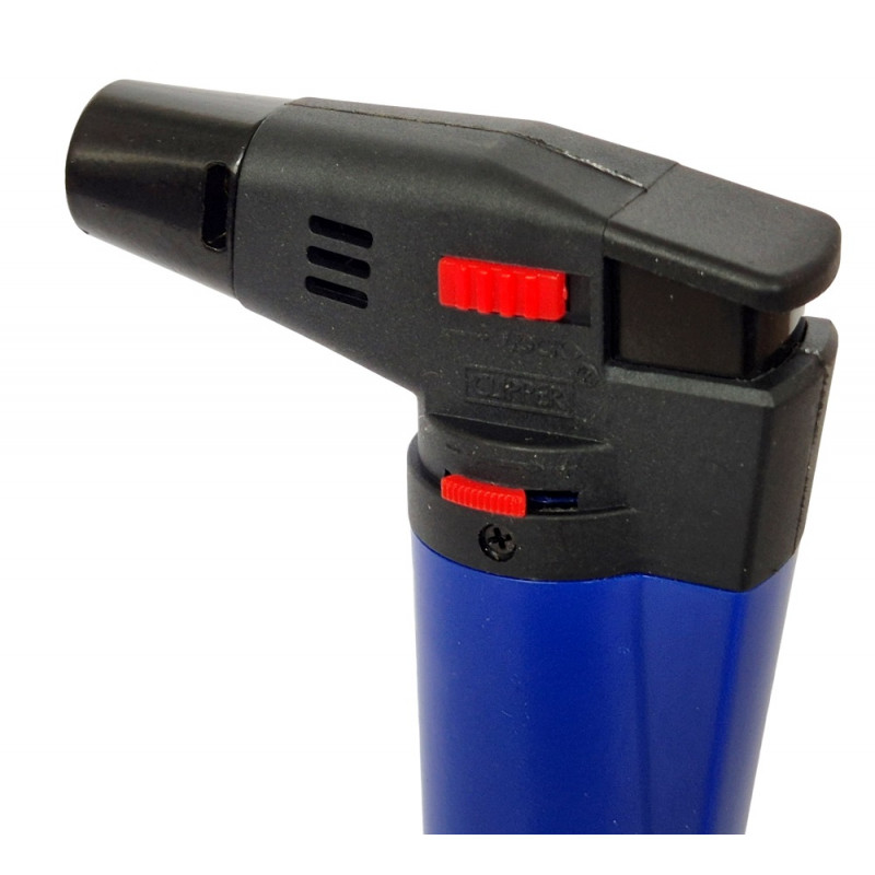Palnik posiada zawór do ponownego napełniania gazem, regulację wysokości płomienia oraz blokadę przed przypadkowym uruchomieniem, co podnosi bezpieczeństwo użytkowania.