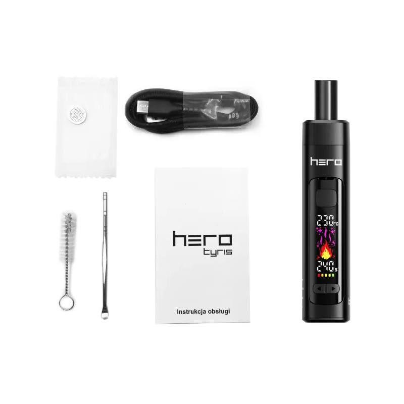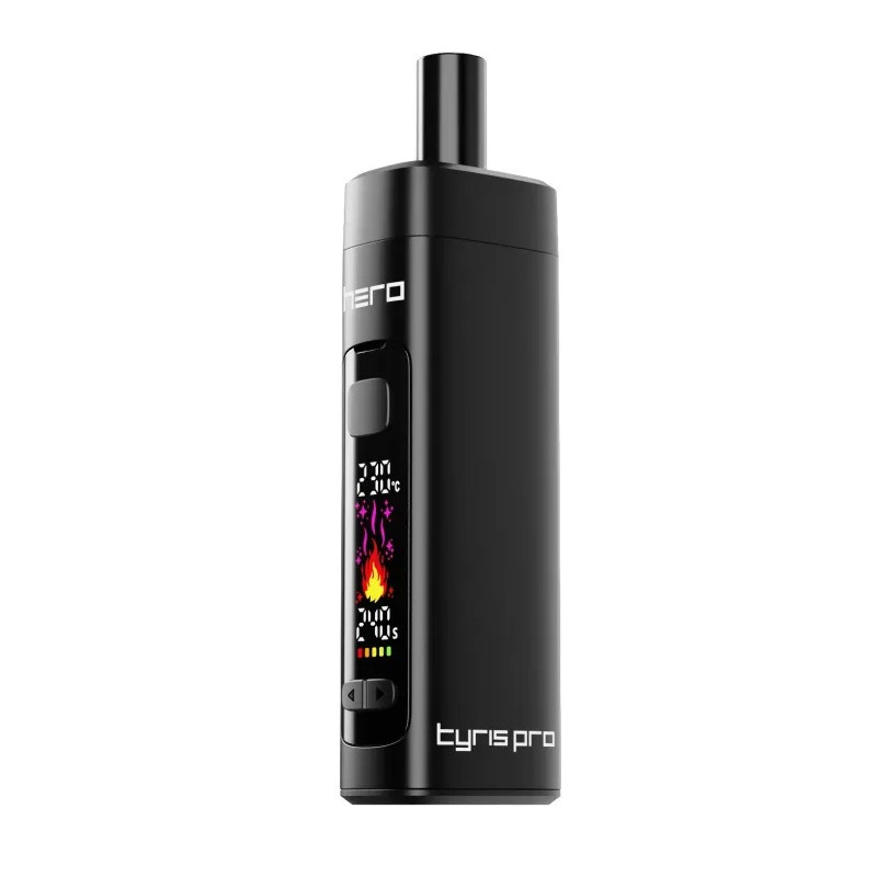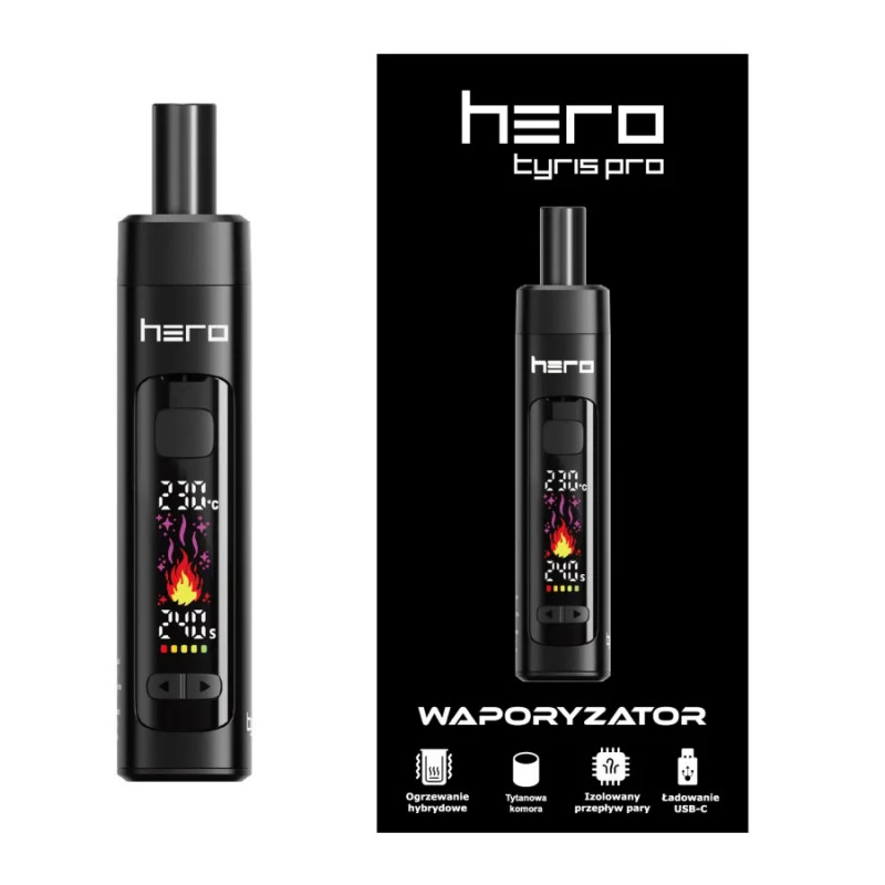 TYRIS PRO HERO to ulepszona wersja popularnego waporyzatora marki HERO z tytanową komorą grzewczą, hybrydowym systemem grzania (konwekcja + kondukcja) i technologią Smart Puff Identify. Nagrzewa się w 20 sekund, oferuje zakres temperatur 160–230°C z regulacją co 1°C i mieści się w kieszeni.