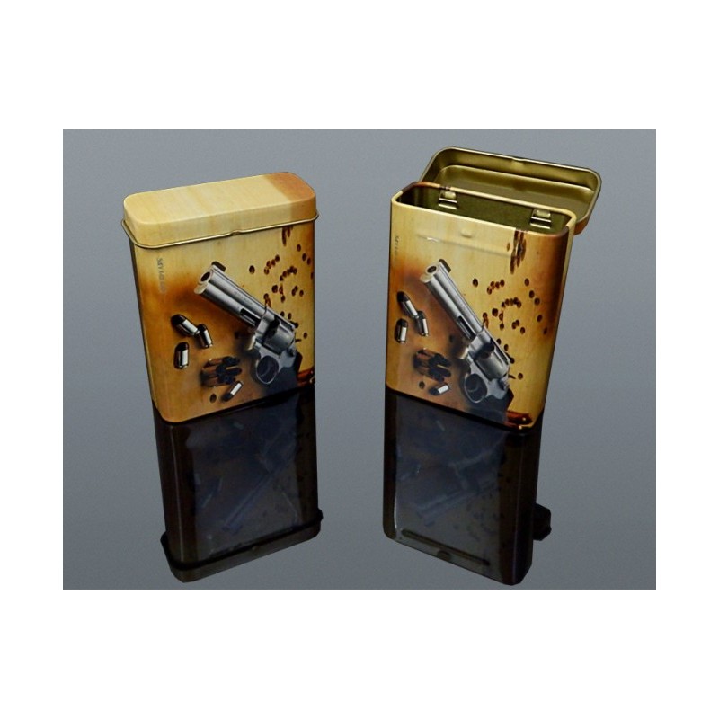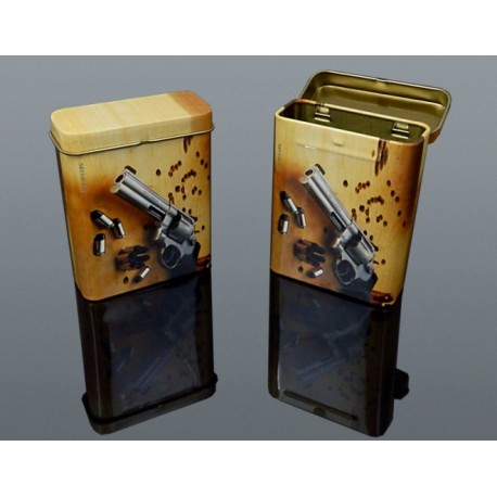 Praktyczna i trwała papierośnica metalowa ładowana od góry mieszcząca 20 papierosów standardowej wielkości.